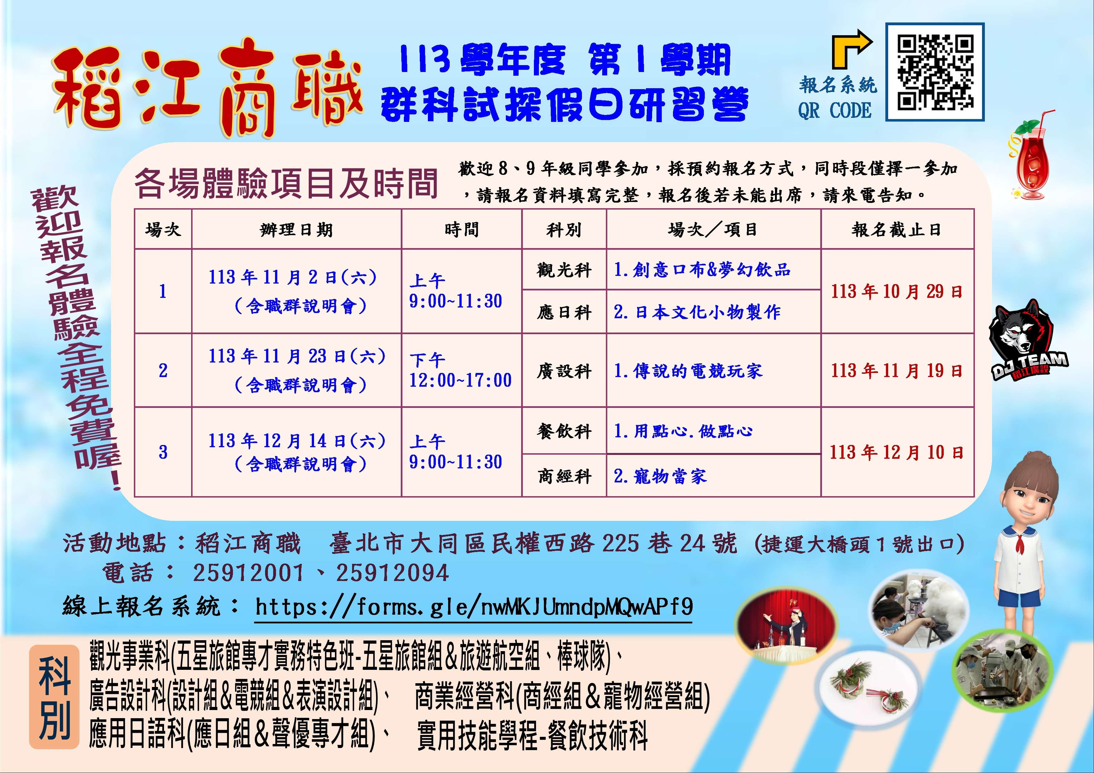 提供國中8、9年級學生能認識稻江商職科系之特色及專業發展之生涯規劃