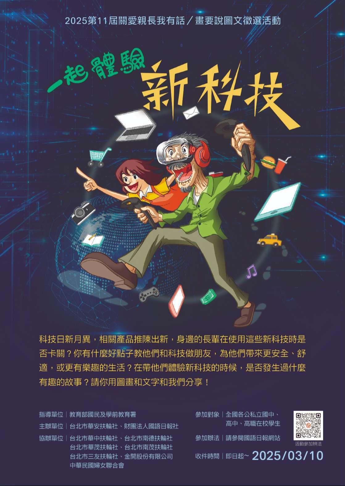 一、為鼓勵高級中等學校及國民中學學生勇於表達對親長的關愛,財團法人國語日報社與臺北市華安扶輪社共同辦理第11屆「關愛親長 我有話/畫要說」圖文徵選活動。