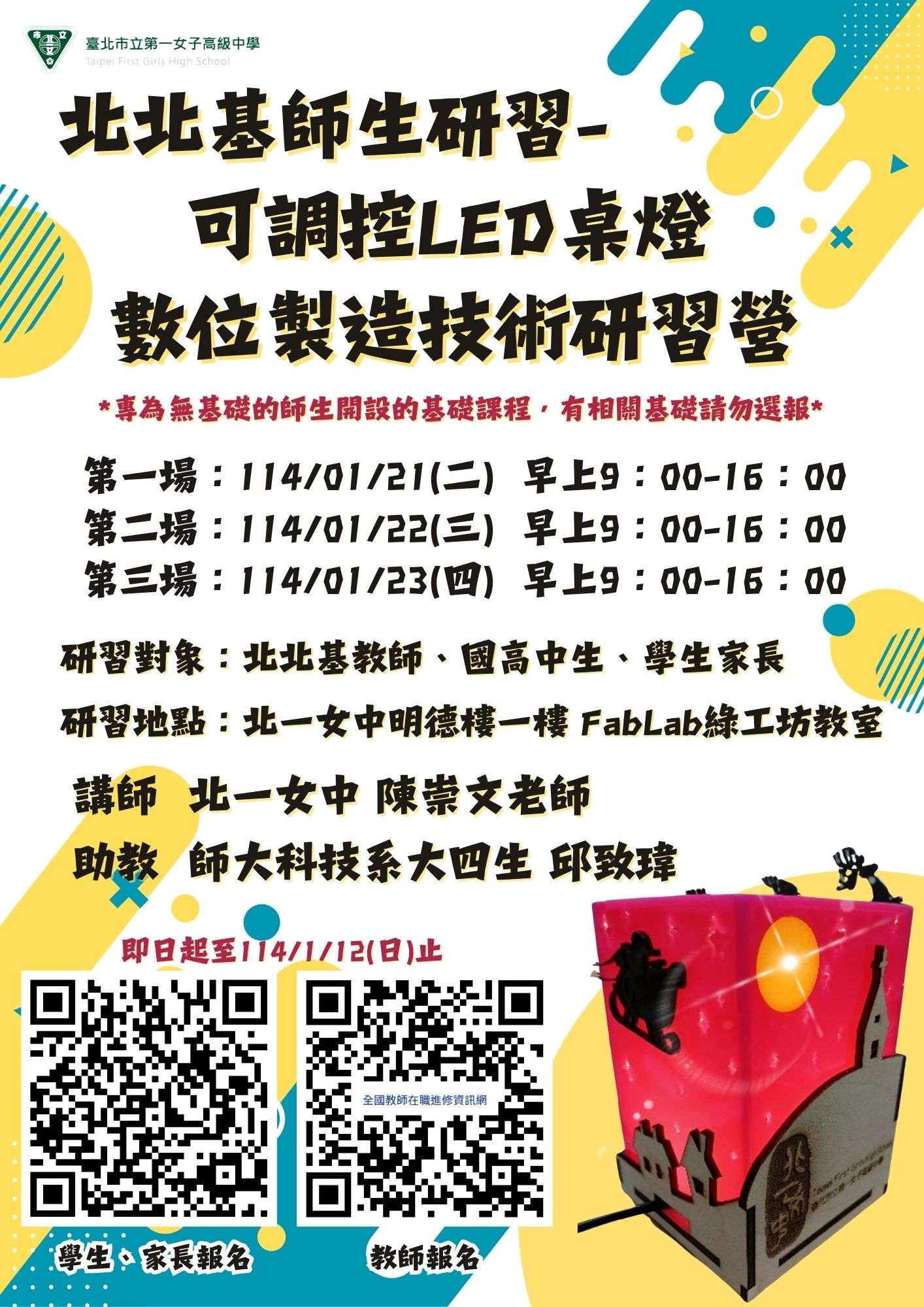 一、研習主題:北北基師生研習—可調控LED桌燈數位製造技術研習營。