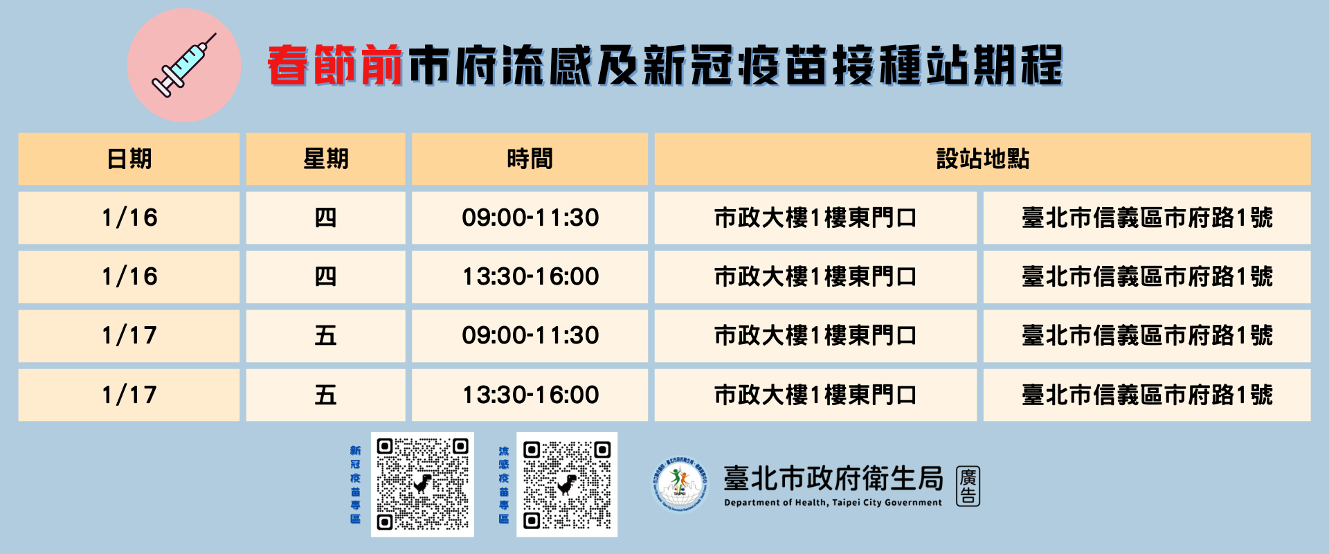 (四)地點:本市市政大樓東區1樓醫務室旁(臺北市市府路1號原信義戶政工作站前)。