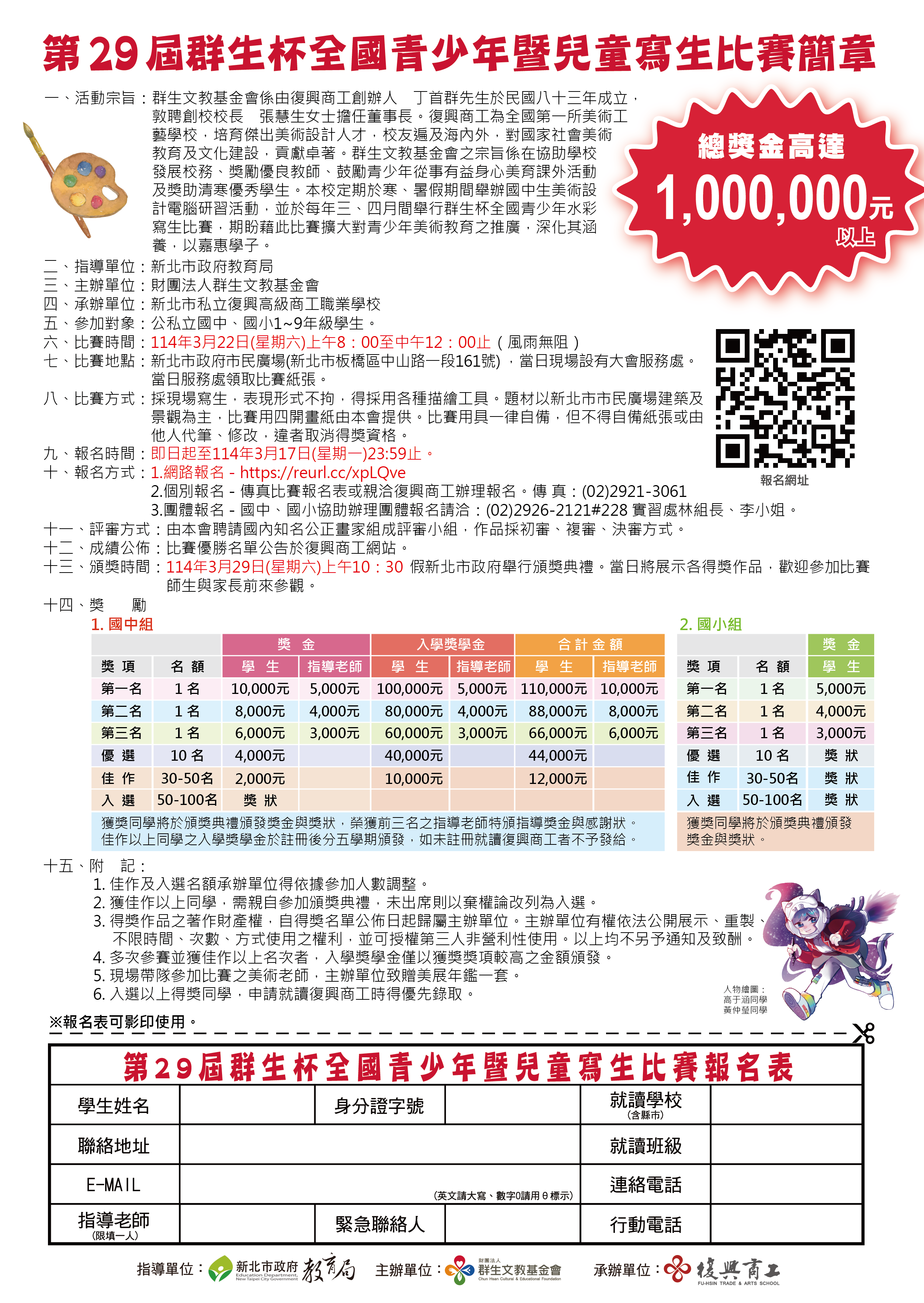 六、比賽簡章公告於群生基金會網站首頁 http://ischool.fhvs.ntpc.edu.tw/ischool/publish_page/193/,敬請下載查閱。