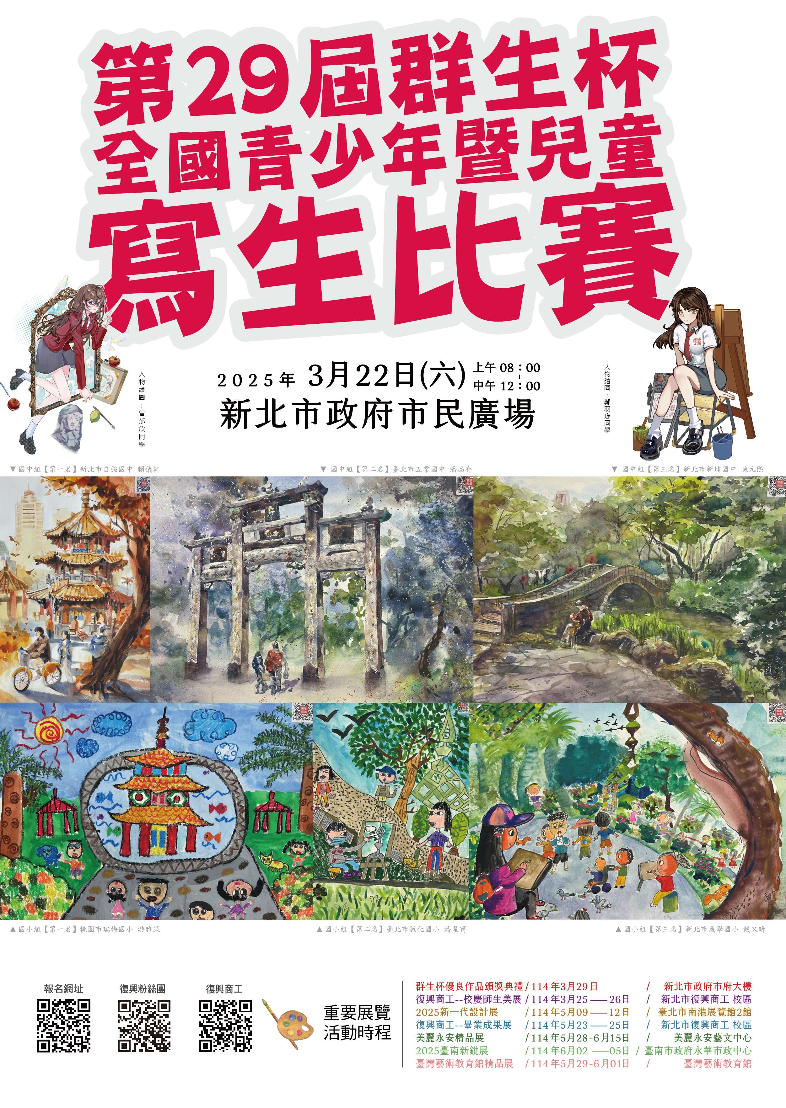 三、比賽方式:採現場寫生方式,題材以新北市市民廣場建築及景觀為主,比賽使用四開畫紙,由本會提供,用具一律自備,採用任何描繪工具、材料皆可,表現形式不拘。不得自備紙張或由他人代筆、修改,違者取消資格。