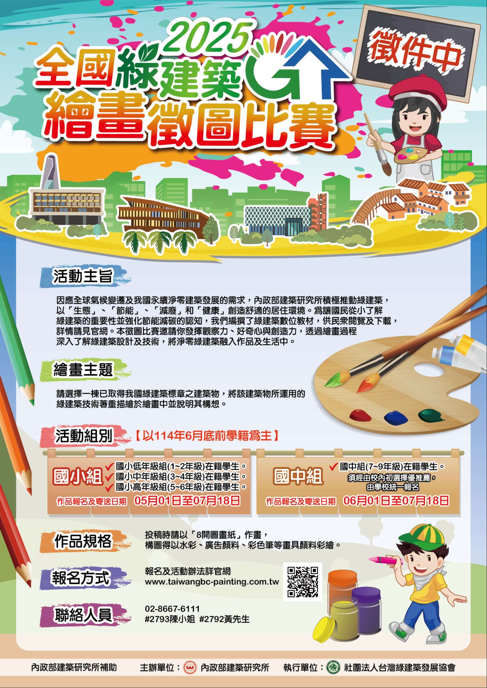 一、為加強綠建築扎根教育成效,本所自105年起辦理「全國綠建築繪畫徵圖比賽」,並自110年度起納入教育部「十二年國民基本教育免試入學超額比序」之全國性競賽項目。本(114)年度「2025全國綠建築繪畫徵圖比賽」活動說明如下:
