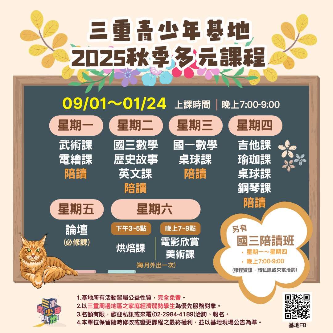 一、三重青少年基地2025秋季多元課程開課期間為9/1(一)~1/24(六)。除周五晚上的「論壇」為必修課程,