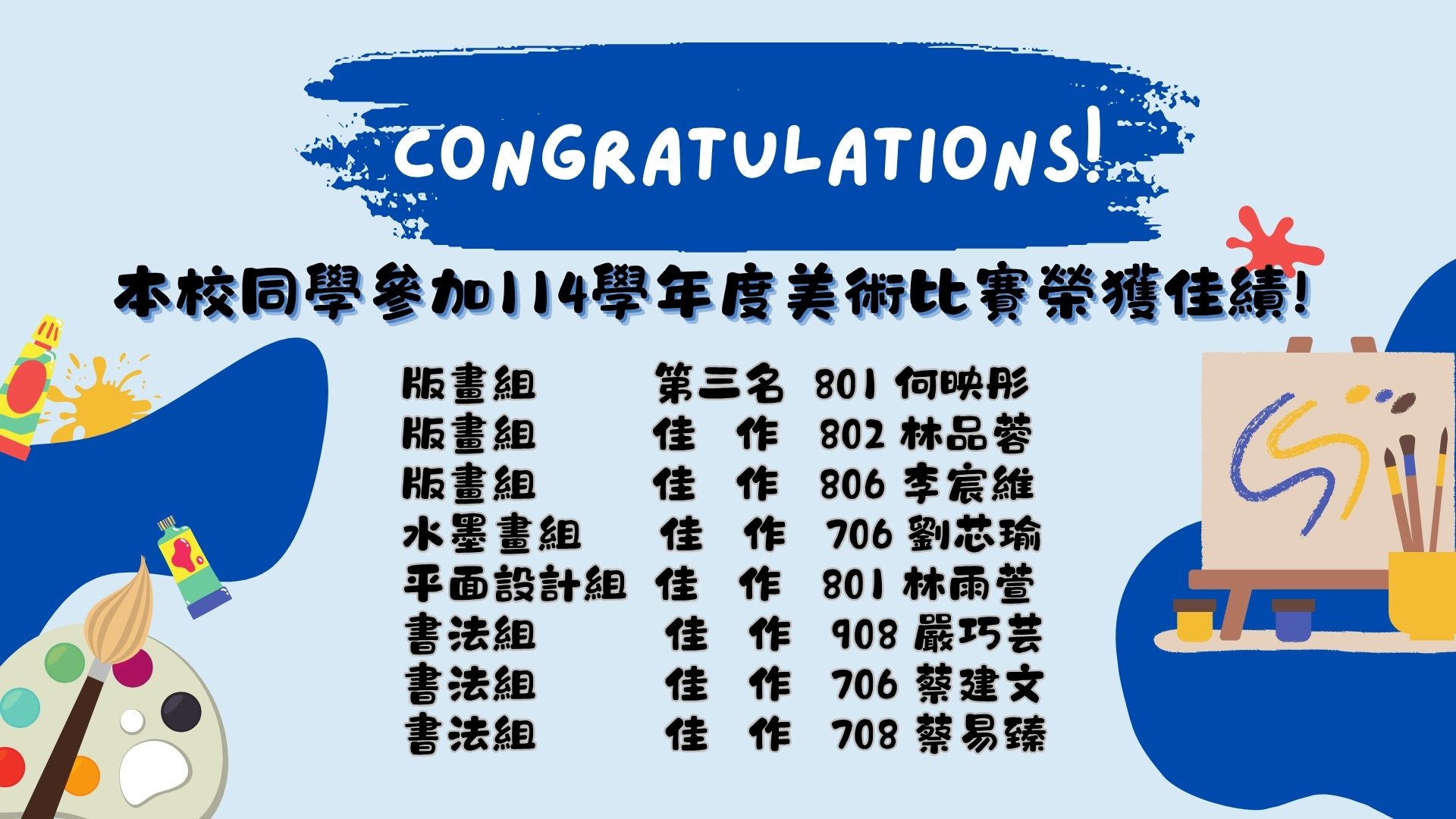賀!恭喜本校同學參加臺北市114年度美術比賽榮獲佳績!!!