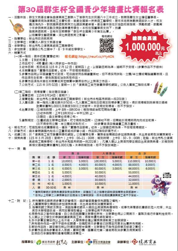一、比賽方式及時間:(詳細資訊請見簡章說明)【第一階段】實體收件 115年 2月 12日 (星期四) 前,郵戳為準【第二階段】現場複賽 115年 3月 14日 (星期六) 8時 至12時地點:復興商工
