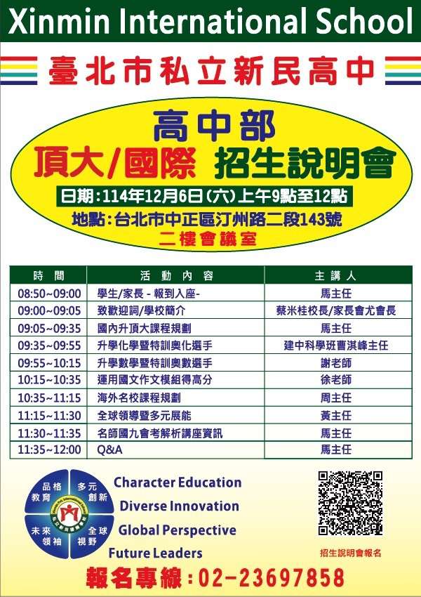 報名方式:可至本校官網或掃描附件QR Code。