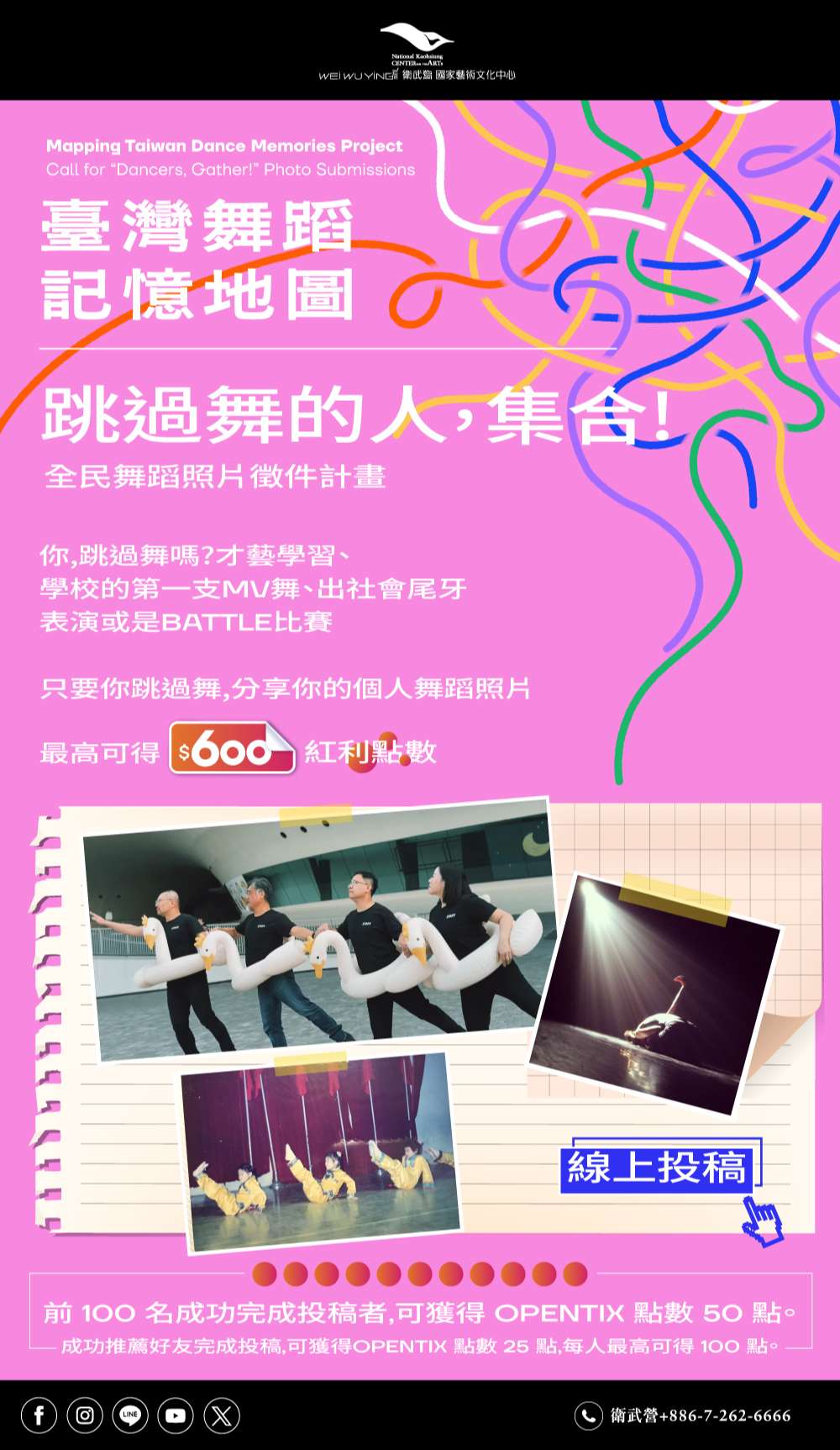 (二)「跳過舞的人,集合!」全民舞蹈照片徵件活動參考簡章(附件二)或衛武營官網網址:https://npacwwy.tw/en08gMrIj,邀請師生共同參與投稿。